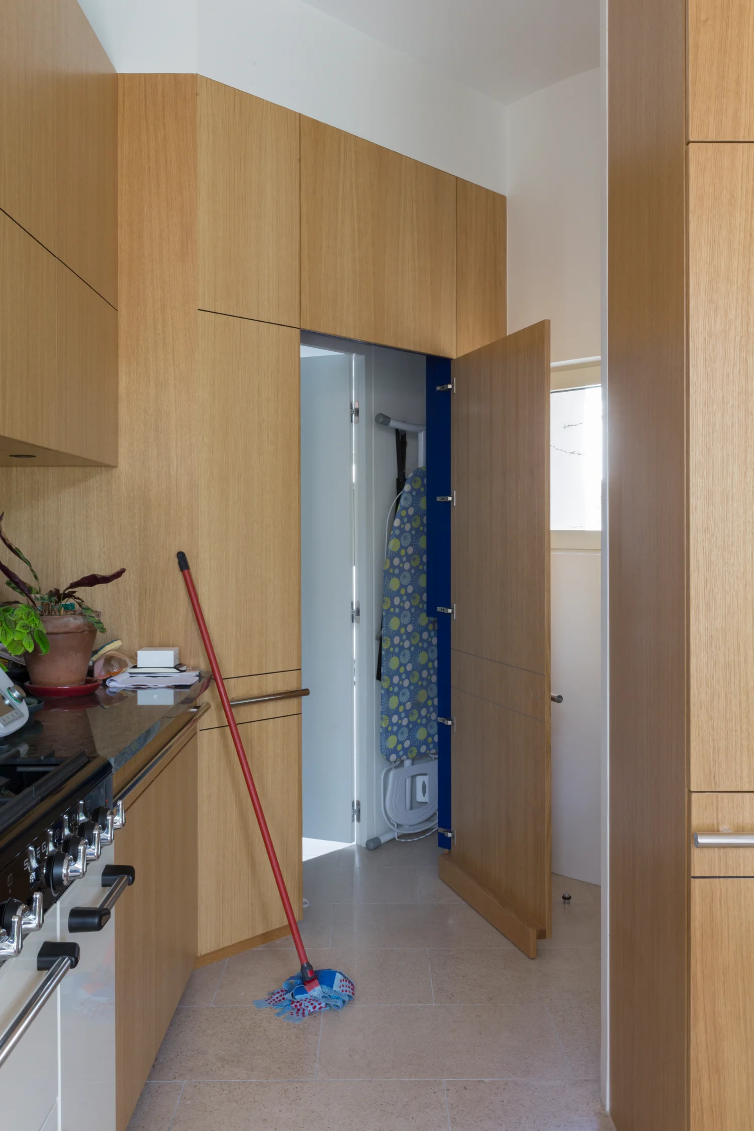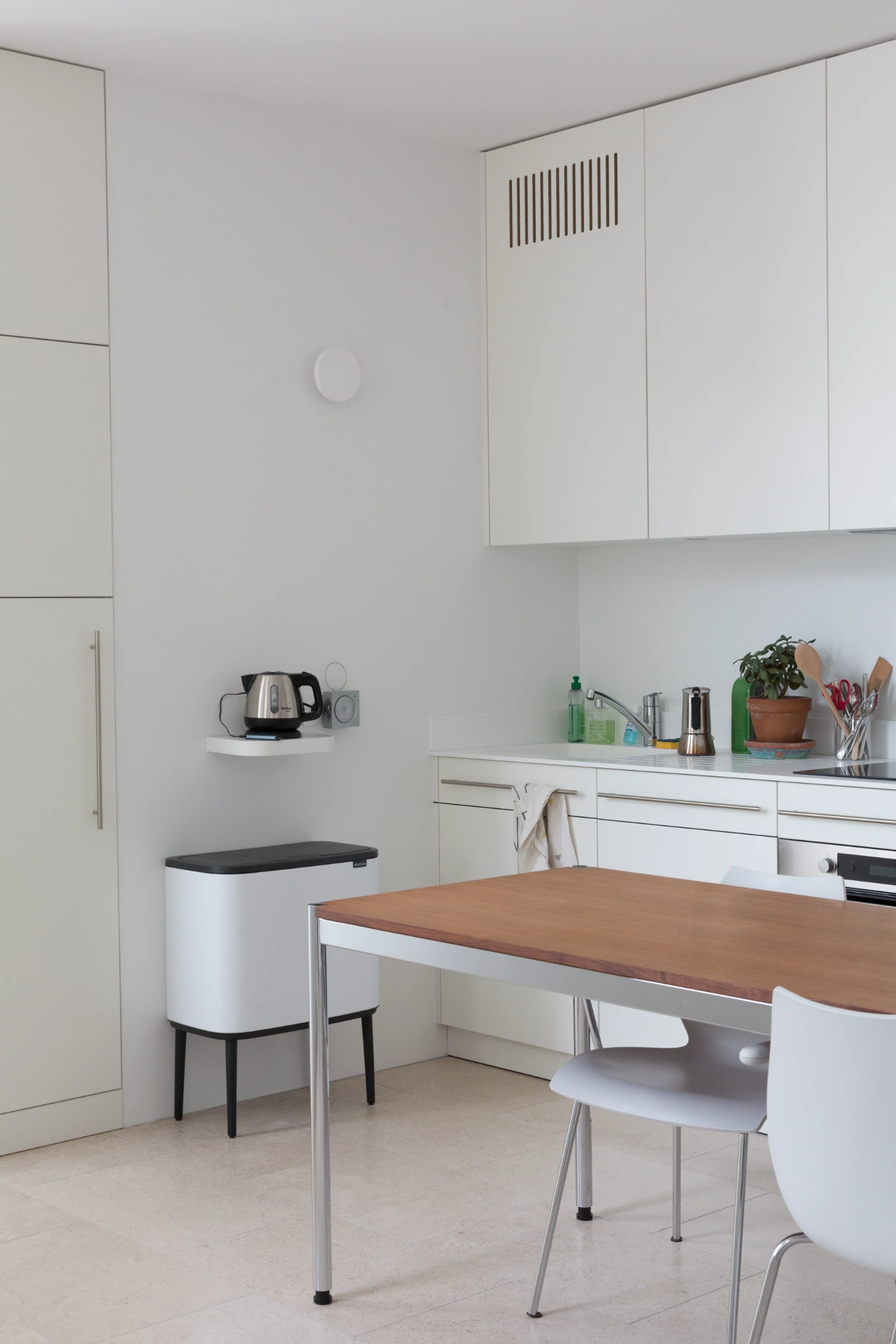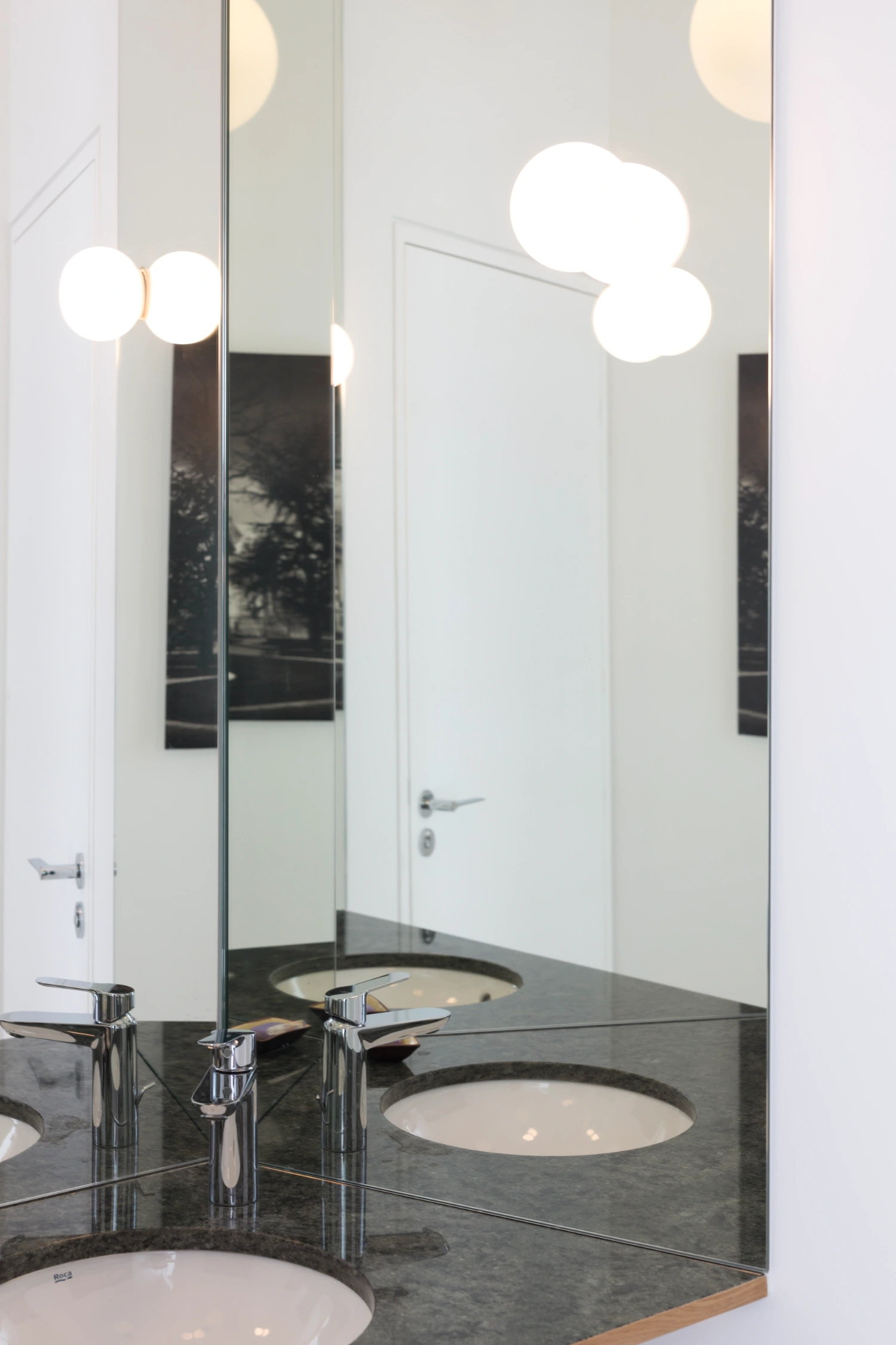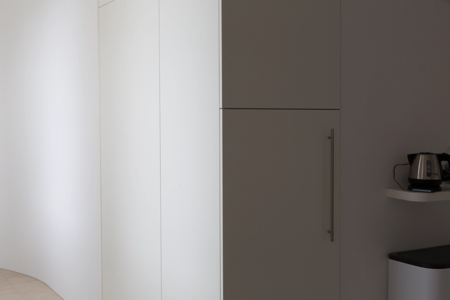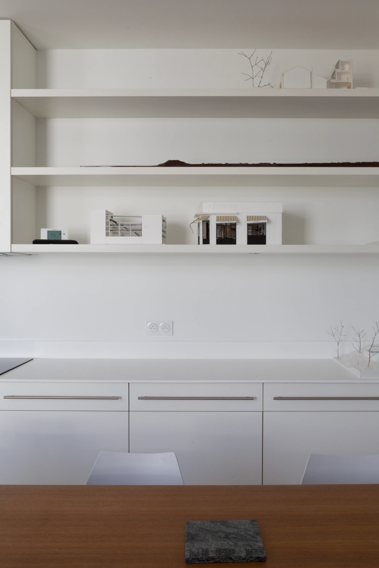 La cuisine, traitée dans un esprit minimaliste, s’intègre parfaitement à l’ensemble grâce à des façades sobres et des solutions de rangement discrètes. Les aménagements muraux et les éléments intégrés renforcent la sensation d’espace tout en apportant une fonctionnalité quotidienne optimale.